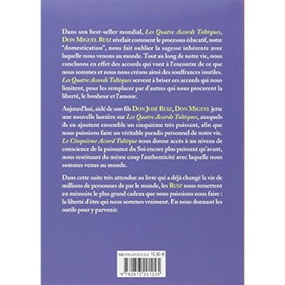 Aujourd'hui, aidé de son fils Don José Ruiz, Don Miguel jette une nouvelle lumière sur Les Quatre Accords Toltèques, auxquels ils en ajoutent ensemble un cinquième très puissant, afin que nous puissions faire un véritable paradis personnel de notre vie. Le Cinquième Accord Toltèque nous donne accès à un niveau de conscience de la puissance du Soi encore plus puissant qu'avant, nous restituant du même coup l'authenticité avec laquelle nous sommes venus au monde. Dans cette suite très attendue au livre qui a déjà changé la vie de millions de personnes de par le monde, les Ruiz nous remettent en mémoire le plus grand cadeau que nous puissions nous faire : la liberté d'être qui nous sommes vraiment. En nous donnant les outils pour y parvenir
