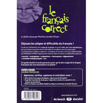 Déjouez les pièges et difficultés du français ! Fondé sur l'observation de l'usage de la langue, ce guide traite, par ordre alphabétique, des questions courantes et des difficultés de vocabulaire et de grammaire. Il comprend de nombreux exemples, classiques et actuels ainsi qu'un index détaillé. LE FRANÇAIS CORRECT apporte une réponse claire et rapide aux difficultés suivantes : ° accords ° conjugaisons ° prépositions ° homonymes ° régionalismes ° curiosités orthographiques ° etc. Un guide destiné à toute personne pour qui le bon usage de la langue française est une nécessité et un plaisir ! GREVISSE LANGUE FRANÇAISE Apprenez, vérifiez, explorez et entraînez-vous ! ° Une série d'ouvrages pratiques, rigoureux et attrayants ° À garder à portée de main pour répondre à toutes les questions de langue au quotidien ° Dans la filiation du BON USAGE de Maurice Grevisse et André Goosse