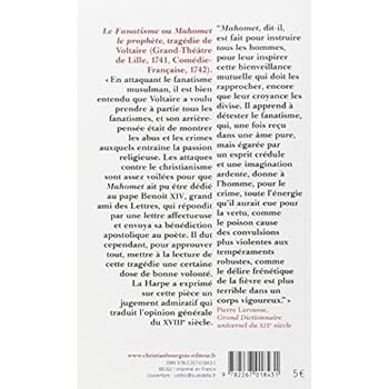 Le Fanatisme ou Mahomet le prophète, tragédie de Voltaire (Grand Théâtre de Lille, 1741, Comédie-Française, 1742). " En attaquant le fanatisme musulman, il est bien entendu que Voltaire a voulu prendre à partie tous les fanatismes, et son arrière-pensée était de montrer les abus et les crimes auxquels entraîne la passion religieuse. Les attaques contre le christianisme sont assez voilées pour que Mahomet ait pu être dédié au pape Benoît XIV, grand ami des Lettres, qui répondit par une lettre affectueuse et envoya sa bénédiction apostolique au poète. Il dut cependant, pour approuver tout, mettre à la lecture de cette tragédie une certaine dose de bonne volonté. La Harpe a exprimé sur cette pièce un jugement admiratif qui traduit l'opinion générale du XVIIIe siècle. "Mahomet, dit-il, est fait pour instruire tous les hommes, pour leur inspirer cette bienveillance mutuelle qui doit les rapprocher, encore que leur croyance les divise. Il apprend à détester le fanatisme, qui, une Fois reçu dans une âme pure, mais égarée par un esprit crédule et une imagination ardente, donne à l'homme, pour le crime, toute l'énergie qu'il aurait eue pour la vertu, comme le poison cause des convulsions plus violentes aux tempéraments robustes, comme le délire frénétique de la fièvre est plus terrible dans un corps vigoureux."